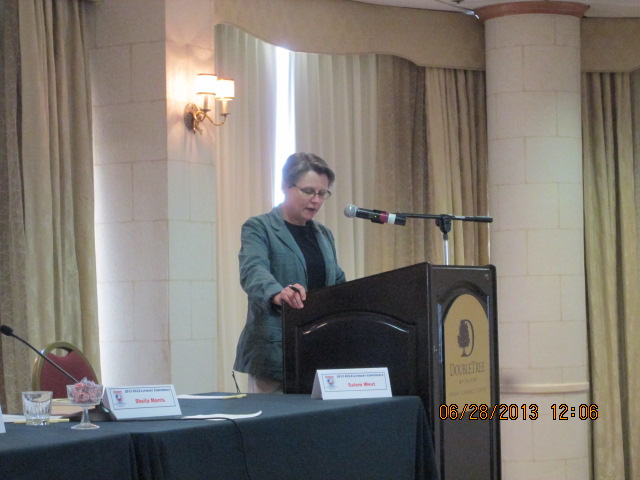 IMG_1132Not long before that GCLS Panel (featuring Elaine Mulligan and Lynne Pierce, and moderated by Carleen Spry) I published an editorial on The Rainbow Reader titled The Lesfic Boomtown Foretold: A Cautionary Tale by Salem West.  The thesis was that growth is a good thing, but too much growth too quickly can easily overwhelm an industry. Along with the huge increase in demand by readers of lesbian literature in the last three years, I see a significant decrease in the quality of writing, editing and publishing across the industry. I also see a reading population that has not yet found its voice when it comes to speaking up for their rights and expectations as readers. That is not to say that all writing, editing, and publishing is bad, because it isn’t. Likewise, there are several loud and proud voices in the reading community that continue to call for a correction. Still, across-the-board, we all need to consider our pursuit of growth in conjunction with our ability to develop authors, publish their products, and advance the legacy that our foremothers entrusted to us.